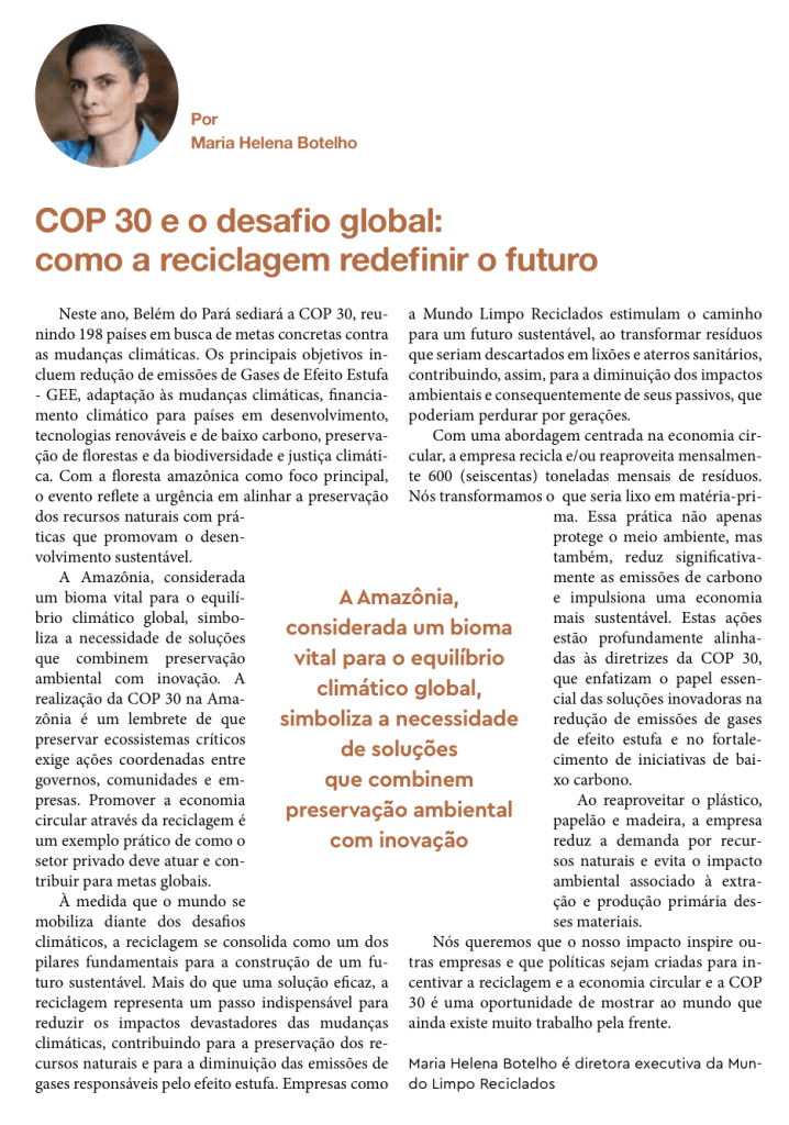 Por Maria Helena Botelho — Diretora Executiva da Mundo Limpo Reciclados